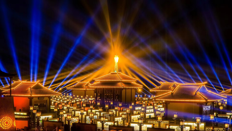 2019年1月,“九曲黃河燈陣”被上海大世界評為“中國規(guī)模最大的燈陣”,配套升級演出《張國臂掖》是中國首部以漢代軍事主題為主的大型實景光影劇,將燈陣啟燈儀式、實景演藝與燈光秀表演高度融合,將傳統(tǒng)文化之美,通過“燈”這種象征吉祥寓意的媒介,以“浸入”的形式,讓觀眾作為整個空間形態(tài)演變的參與者,感受到漢代屋蘭古鎮(zhèn)市井風貌,穿越到大漢年代的繁華街巷,給游客帶來身臨其境的互動體驗享受。