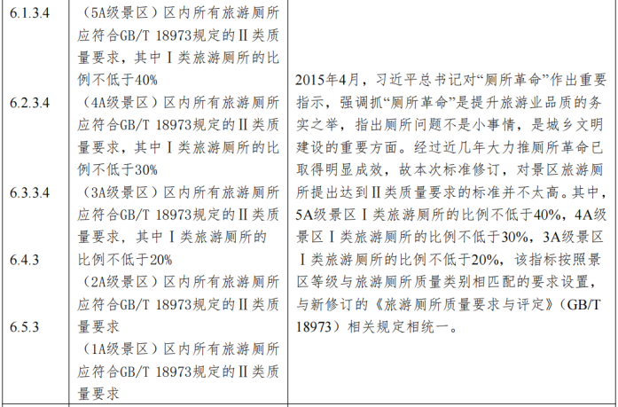 修訂情況:一是保留了原標(biāo)準(zhǔn)中“游覽”的主要內(nèi)容,“游客中心”中增加了電子版公眾信息資料和高等級景區(qū)宜提供郵政紀(jì)念、手機(jī)充電、飲用冷熱水、小型物品與寵物托管、代訂與快遞景區(qū)商品及其他多種增值服務(wù)要求。二是將原“旅游交通”中景區(qū)內(nèi)游覽路線與交通工具的內(nèi)容調(diào)整到本部分;三是將原標(biāo)準(zhǔn)“衛(wèi)生”部分涉及的廁所和垃圾箱內(nèi)容調(diào)整到“游覽設(shè)施”中,并對不同等級的景區(qū)提出了相應(yīng)的廁所等級要求。