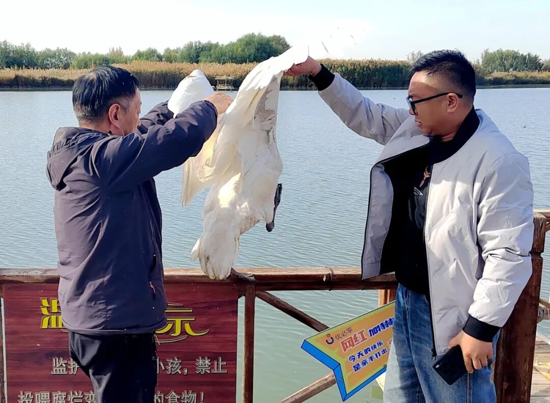 近日,在民樂縣北灘村甘肅龍山種業(yè)有限公司院內,忽然從天降落一只“龐然大物”,該公司負責人邵偉走進一看近乎是一只“大白鶴兒”,立即給民樂縣林草局打電話求助,隨后,民樂縣林草局派工作人員趕赴現(xiàn)場進行接收救助,經檢查無明顯傷痕,嘴部略帶輕微傷跡,初步推測是由于體力不支而落單,識別后得知是一只大天鵝,系國家二級保護動物。