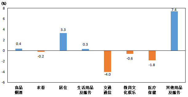 其他七大類價(jià)格同比“三漲四降”。其中,其他用品及服務(wù)類價(jià)格上漲7.4%,居住類價(jià)格上漲3.3%,生活用品及服務(wù)類價(jià)格上漲0.3%;交通通信類價(jià)格下降4.0%,醫(yī)療保健類價(jià)格下降1.8%,教育文化娛樂類價(jià)格下降0.6%,衣著類價(jià)格下降0.2%。