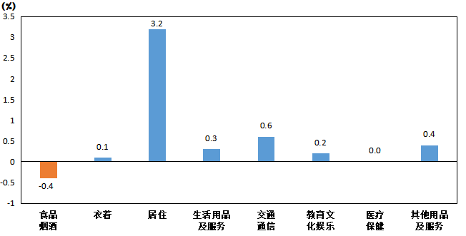 其他七大類價(jià)格環(huán)比“六漲一平”。其中,居住類價(jià)格上漲3.2%,交通通信類價(jià)格上漲0.6%,其他用品及服務(wù)類價(jià)格上漲0.4%,生活用品及服務(wù)類價(jià)格上漲0.3%,教育文化娛樂類價(jià)格上漲0.2%,衣著類價(jià)格上漲0.1%;醫(yī)療保健類價(jià)格與上月持平。