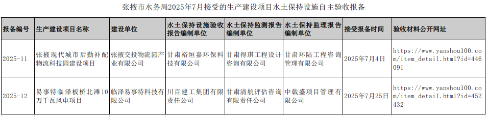 根據(jù)《國務院關于取消一批行政許可事項的決定》(國發(fā)〔2017〕46號)、《水利部關于加強事中事后監(jiān)管規(guī)范生產(chǎn)建設項目水土保持設施自主驗收的通知》(水保〔2017〕365號)、甘肅省水利廳關于《加強事中事后監(jiān)管規(guī)范生產(chǎn)建設項目水土保持設施自主驗收實施意見》(甘水水保發(fā)〔2017〕381號)的有關規(guī)定,現(xiàn)就2025年7月我局接受的生產(chǎn)建設項目水土保持設施自主驗收報備有關情況予以公告。