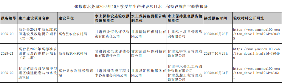 根據(jù)《國務(wù)院關(guān)于取消一批行政許可事項的決定》(國發(fā)〔2017〕46號)、《水利部關(guān)于加強事中事后監(jiān)管規(guī)范生產(chǎn)建設(shè)項目水土保持設(shè)施自主驗收的通知(水?!?017〕365號)、甘肅省水利廳關(guān)于《加強事中事后監(jiān)管規(guī)范生產(chǎn)建設(shè)項目水土保持設(shè)施自主驗收實施意見》(甘水水保發(fā)〔2017〕381號)的有關(guān)規(guī)定,現(xiàn)就2025年10月我局接受的生產(chǎn)建設(shè)項目水土保持設(shè)施自主驗收報備有關(guān)情況予以公告。????