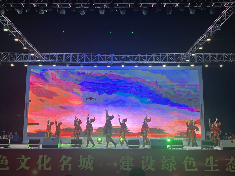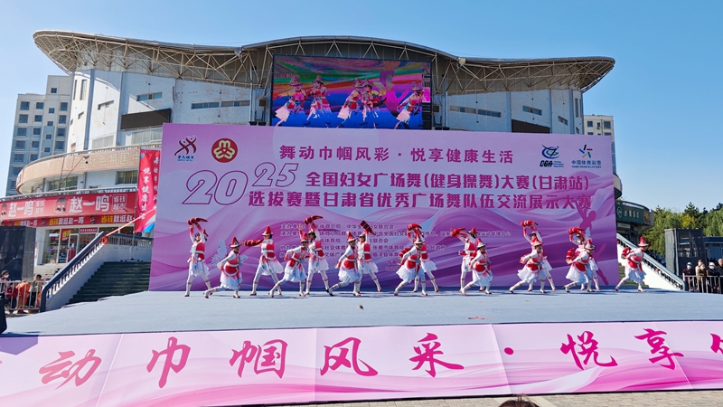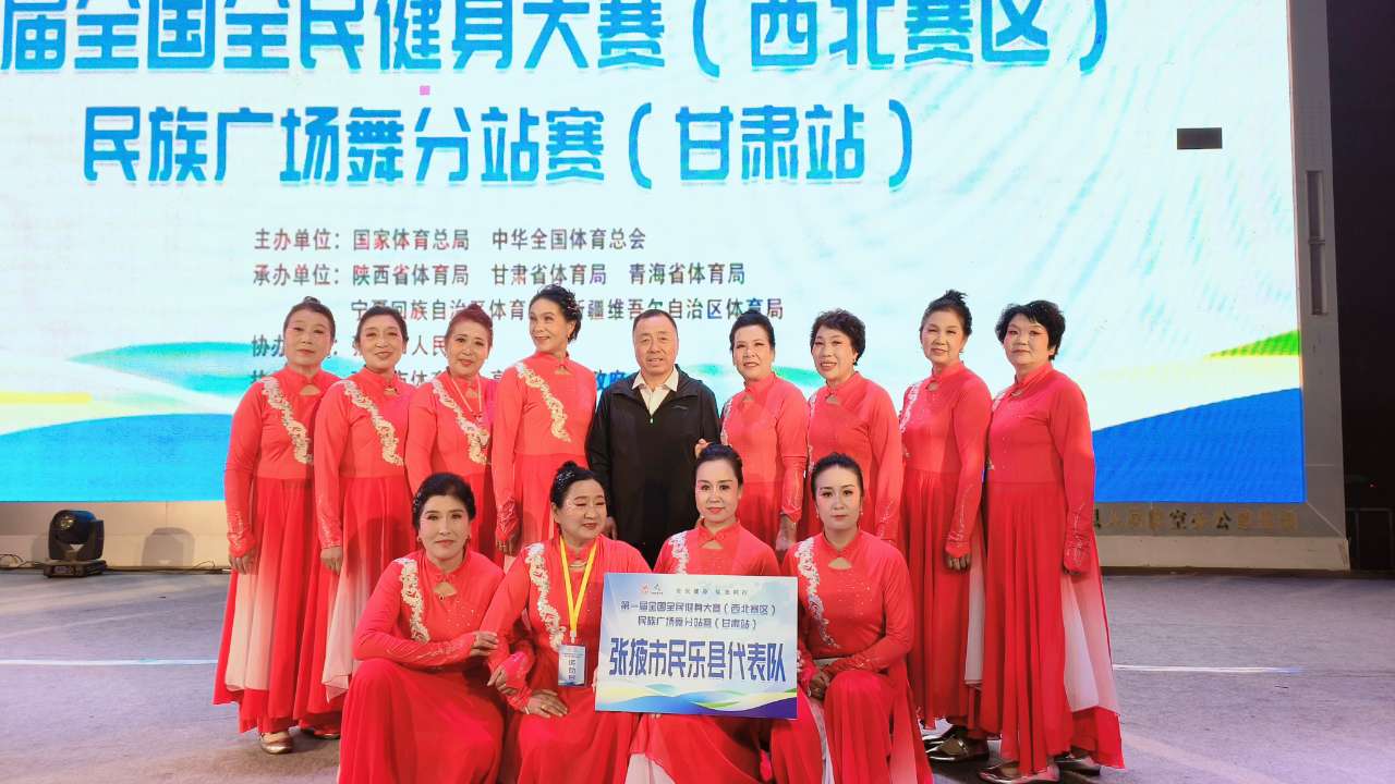 民樂縣代表隊(duì)在第一屆全國(guó)全民健身大賽(西北賽區(qū))民族廣場(chǎng)舞比賽(甘肅站)比賽的舞臺(tái)上亮相