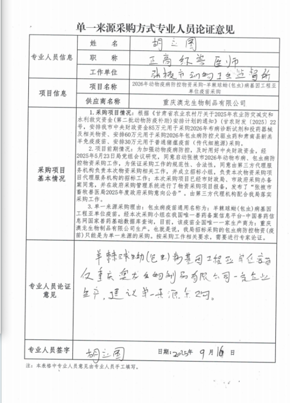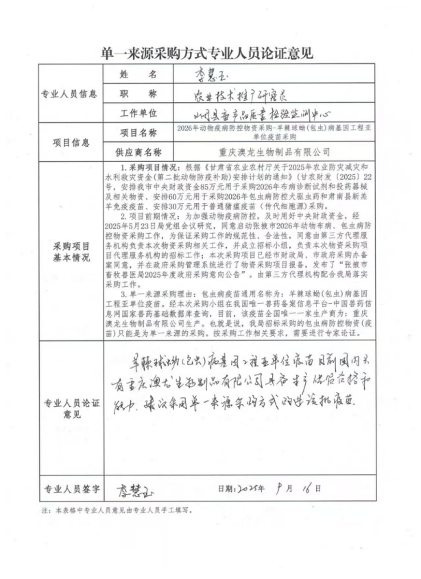 采用單一來源采購方式的原因及說明:根據(jù)《中華人民共和國政府采購法》第三十一條規(guī)定,符合“只能從唯一供應(yīng)商處采購”情形的貨物或服務(wù),可采用單一來源采購方式。在我國唯一的獸藥備案信息平臺——中國獸藥信息網(wǎng)國家獸藥基礎(chǔ)數(shù)據(jù)庫中查詢可知,目前羊球蚴(包蟲)病基因工程亞單位疫苗在全國范圍內(nèi)僅有一家生產(chǎn)商,即重慶澳龍生物制品有限公司。因此,基于該疫苗來源渠道的唯一性,本項目擬采購的羊球蚴(包蟲)病基因工程亞單位疫苗只能從重慶澳龍生物制品有限公司處獲取,符合采用單一來源采購方式的條件。