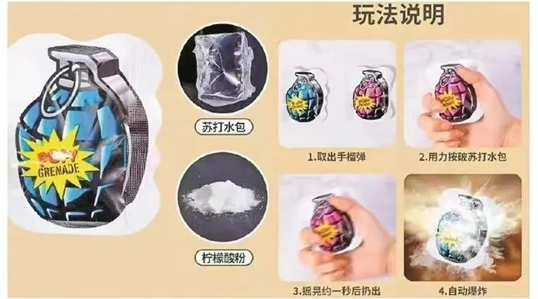 網(wǎng)紅“炸包”玩具,又稱“手榴彈小炸包”“鞭炮小炸包”“仿真手榴彈”等,外包裝五花八門,以“手雷”“鞭炮”等造型居多。“炸包”玩具由一小包液體和粉末狀固體物質(zhì)組成,小包液體是蘇打水包(堿性),固體物質(zhì)是檸檬酸粉(酸性),一旦擠破小包液體包裝,二者發(fā)生化學(xué)反應(yīng),產(chǎn)生二氧化碳?xì)怏w,使得袋子迅速膨脹,隨之爆開(kāi)、發(fā)出響聲。值得注意的是,有些“炸包”玩具在分裝前會(huì)噴上一些硫化鈉水溶液等液體,這些液體具有一定的腐蝕性,接觸到皮膚和毛發(fā)時(shí)可能會(huì)造成灼傷。此外,炸開(kāi)后發(fā)出刺鼻臭氣的“臭包”玩具,其實(shí)是通過(guò)化學(xué)反應(yīng)產(chǎn)生的硫化氫氣體,這是一種急性劇毒,吸入少量高濃度硫化氫可以在短時(shí)間內(nèi)致命。