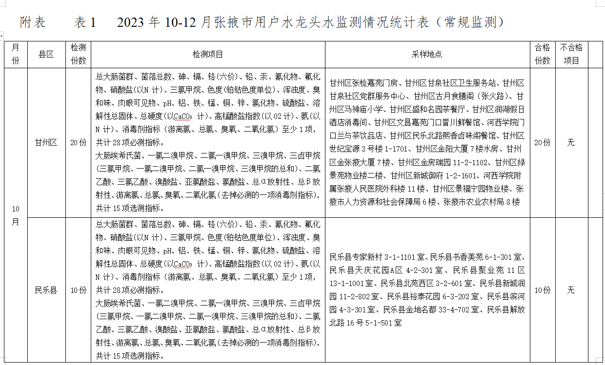 附表:1.2023年10-12月張掖市用戶水龍頭水監(jiān)測(cè)情況統(tǒng)計(jì)表(常規(guī)監(jiān)測(cè))