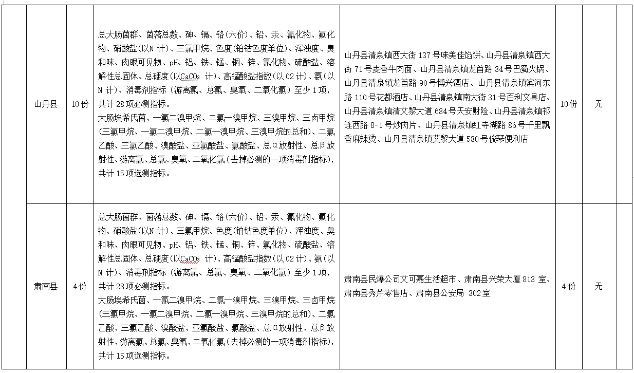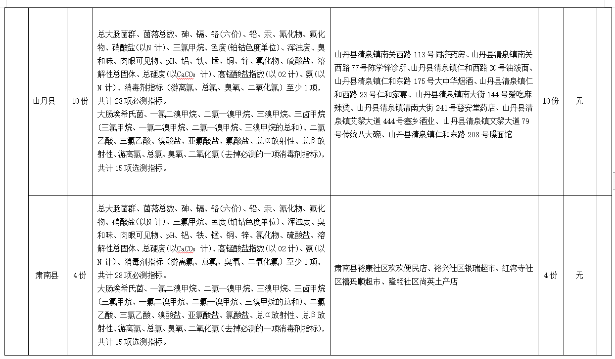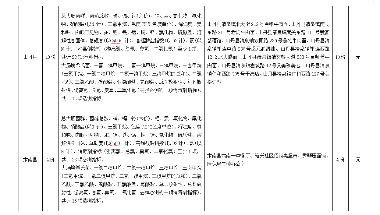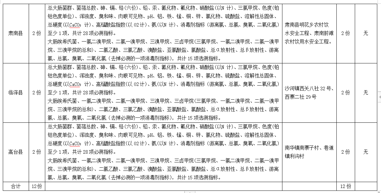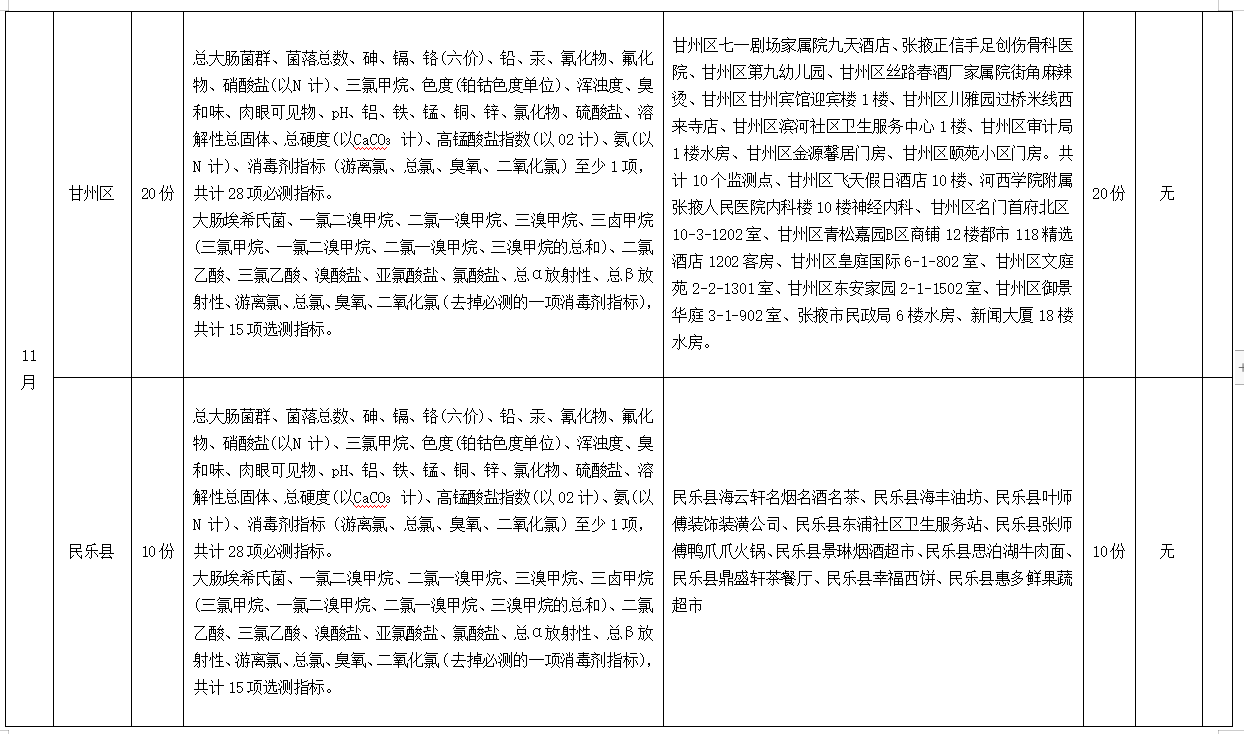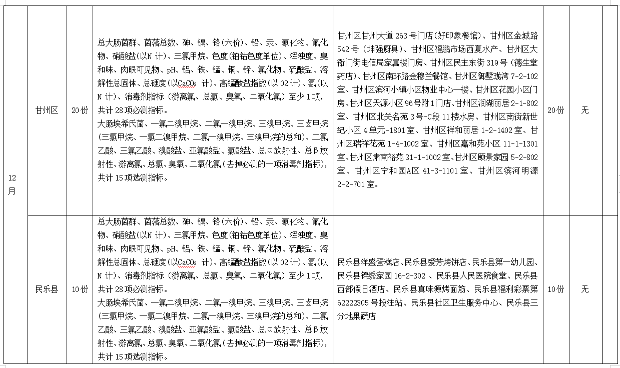 為全面掌握張掖市居民生活飲用水末梢水水質(zhì)衛(wèi)生情況,科學(xué)實(shí)施生活飲用水監(jiān)測(cè)管理,保障人民群眾生活飲用水安全,根據(jù)《張掖市水污染防治工作實(shí)施方案》要求,市縣區(qū)疾控中心開(kāi)展了2023年第四季度用戶水龍頭水水質(zhì)監(jiān)測(cè)工作,現(xiàn)將監(jiān)測(cè)結(jié)果公示如下: