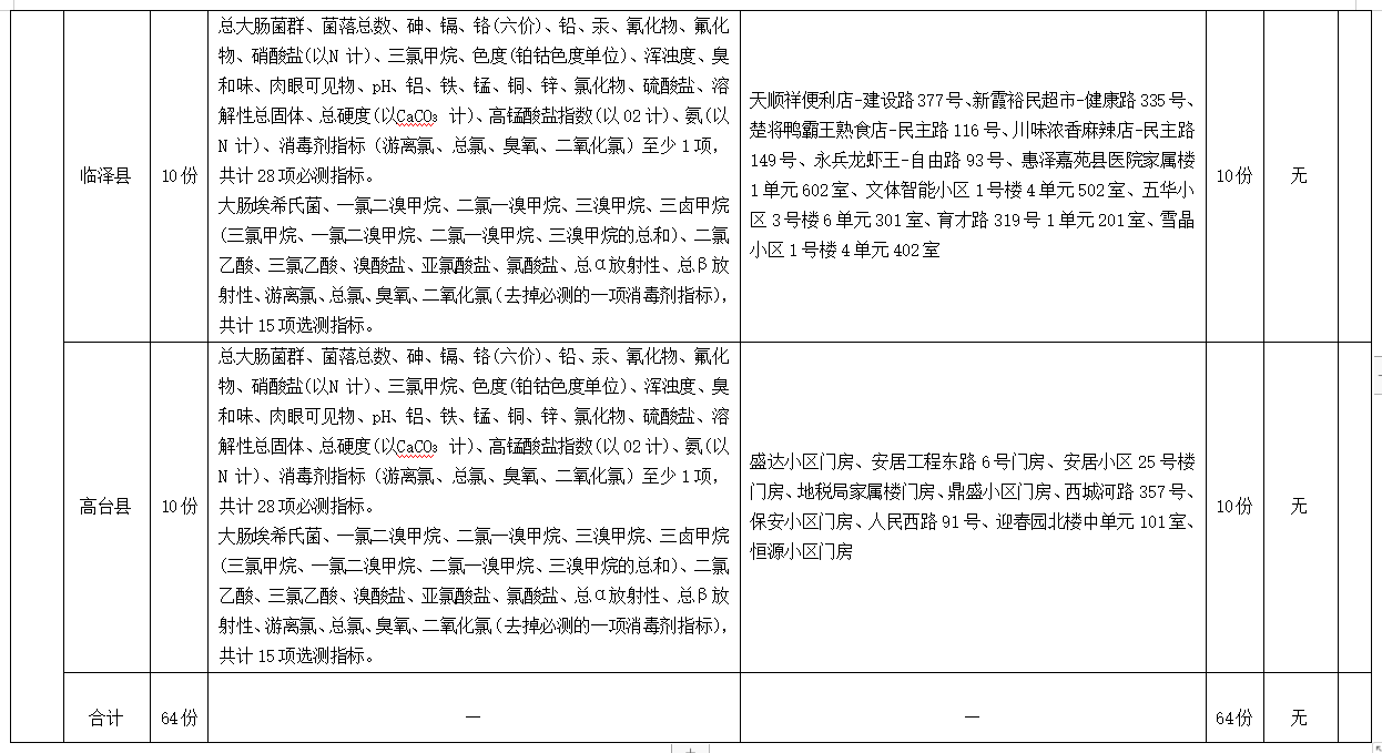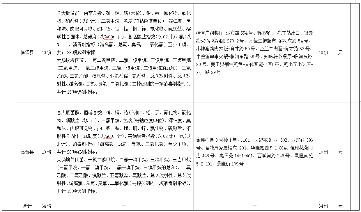 監(jiān)測(cè)覆蓋6縣區(qū)城市供水和農(nóng)村集中式供水,主要監(jiān)測(cè)對(duì)象為各縣區(qū)城區(qū)和農(nóng)村居民生活飲用水末梢水,即用戶水龍頭水。