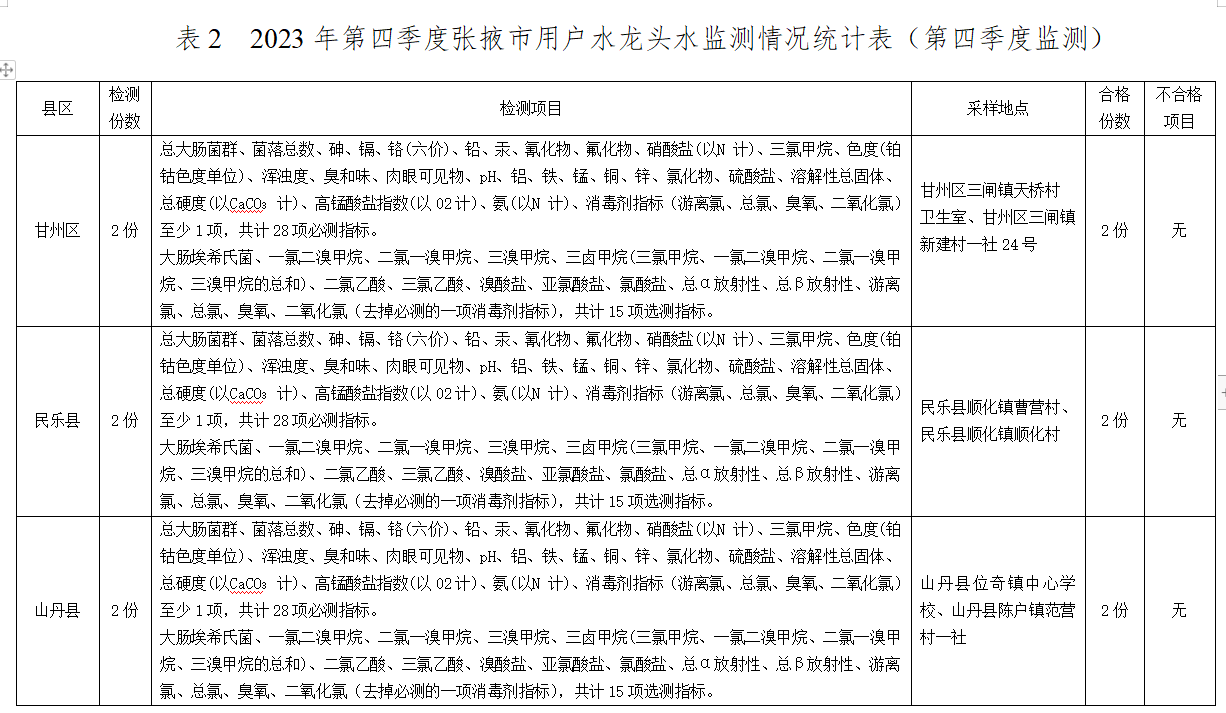 2.2023年第四季度張掖市用戶水龍頭水監(jiān)測(cè)情況統(tǒng)計(jì)表(季度監(jiān)測(cè))