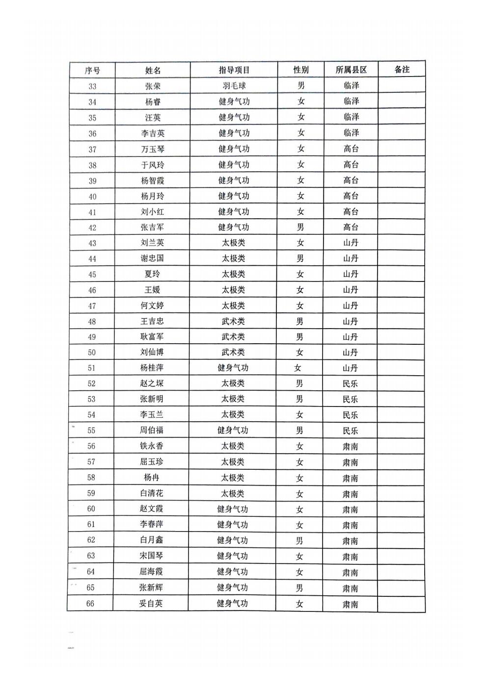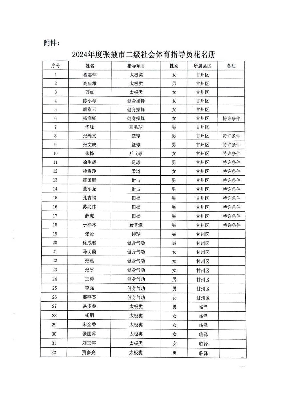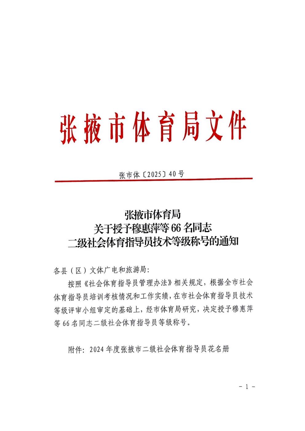 張市體〔2025〕40號(hào) 張掖市體育局關(guān)于授予穆惠萍等66名同志二級(jí)社會(huì)體育指導(dǎo)員技術(shù)等級(jí)稱號(hào)的通知.pdf